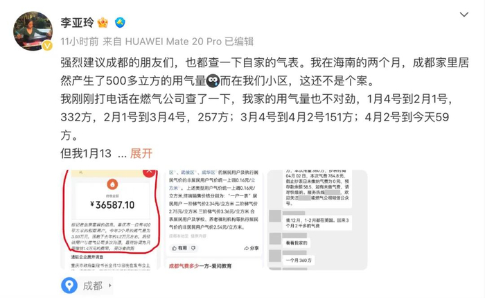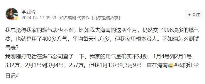 4月17日,知名编剧李亚玲发文称,自己在海南2个月,成都家中产生了500多立方用气量,准备联合有相同遭遇的邻居找第三方检测机构检测燃气表。