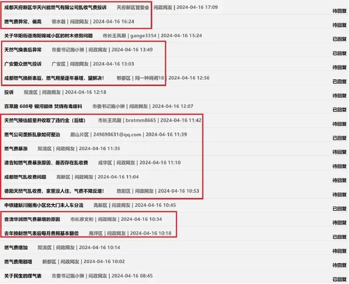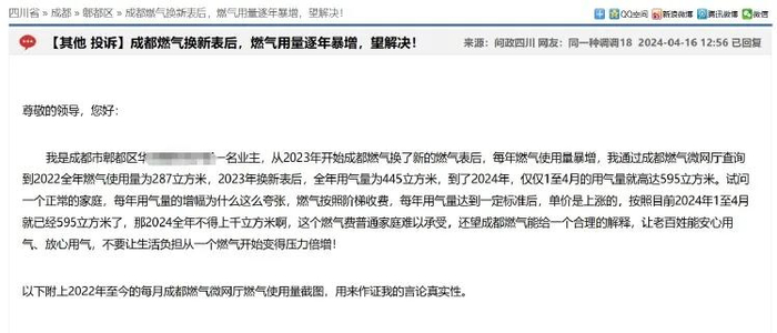近期,四川成都多位居民在四川省网上群众工作平台“问政四川”反映,自2023年更换燃气表后,出现燃气费用异常上涨现象。