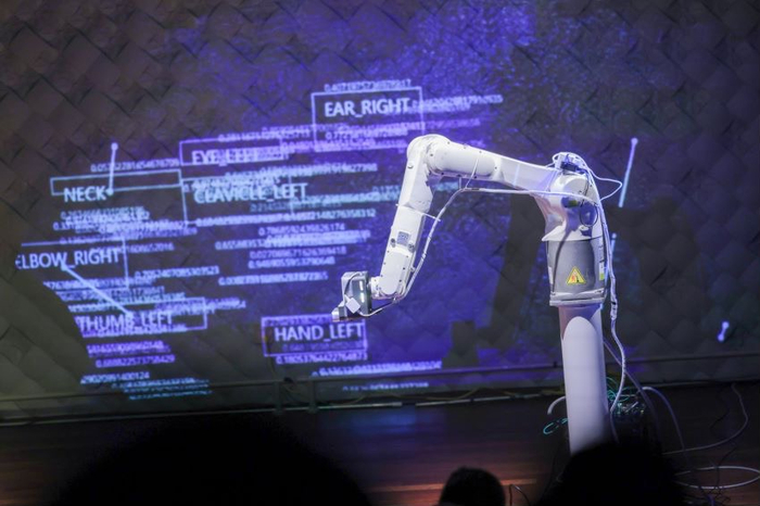 编剧、舞台监督刘晶介绍,“机械臂歌手”艾莉本身作为女主角,主创团队通过动作编排、深度图像采集、智能照明、实时演算等不同技术进行了创造性整合开发。“同时,配合真实资料、模型与文字,基于原创剧本进行的数字化设计创作而成的影像设计,使得‘艾莉’在音乐会中得以流畅地演绎。”