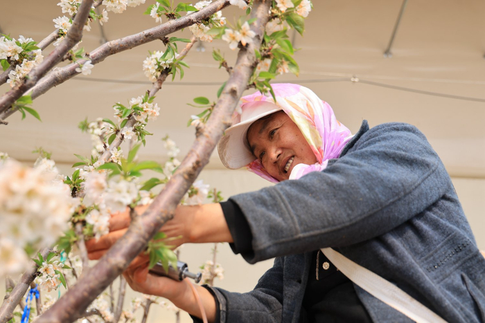 走进内蒙古兴安盟扎赉特旗大樱桃农光互补现代农业产业园项目基地大棚,春意盎然,樱桃树花开满枝头,花香四溢。该园区工作人员正忙着对樱桃树病枝、弱枝及时进行合理修剪,顺着地面向上看去,大棚内有滴灌、喷灌,实行水肥一体化管理,精准控制棚内温度。