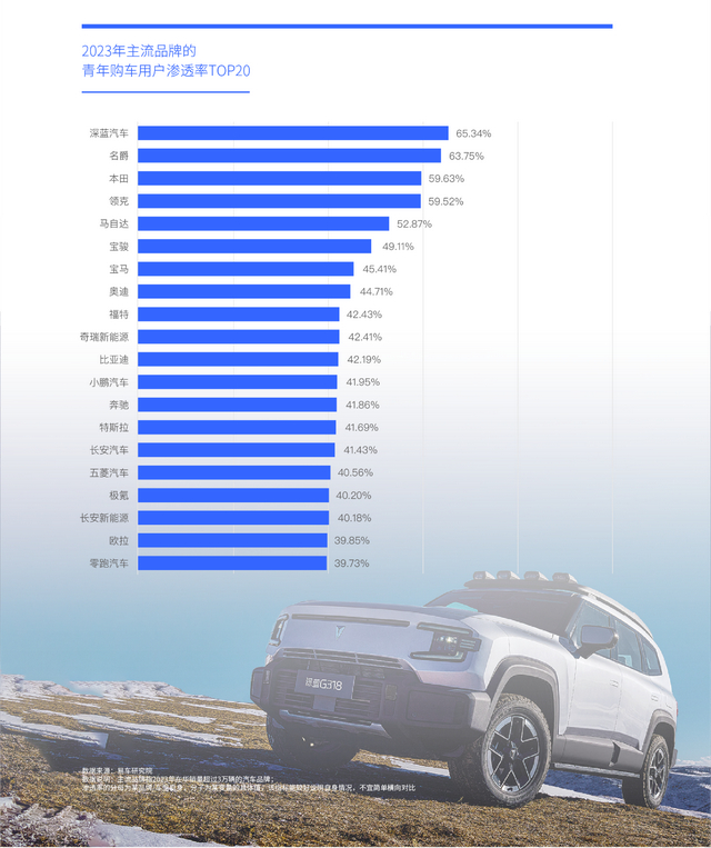 2023年,深蓝汽车的青年渗透率高达65.34%,领衔主流品牌排行榜,更容易打造“三好车”的电气化品牌正加速吸引青年