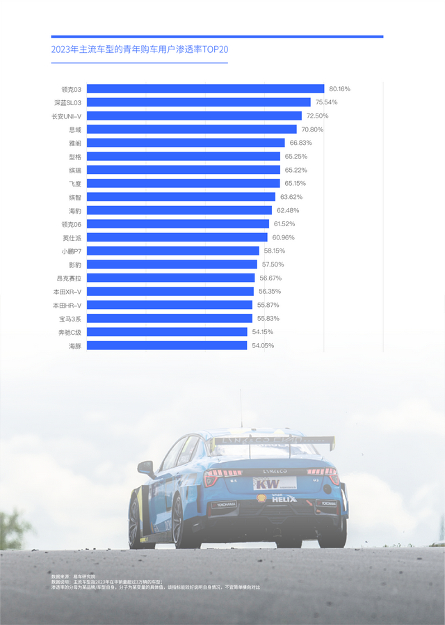 2023年,领克03青年渗透率80.16%,领衔主流车型排行榜,领克07、奕派007等个性混动车,有望成青年车市新黑马,留住更多男青年