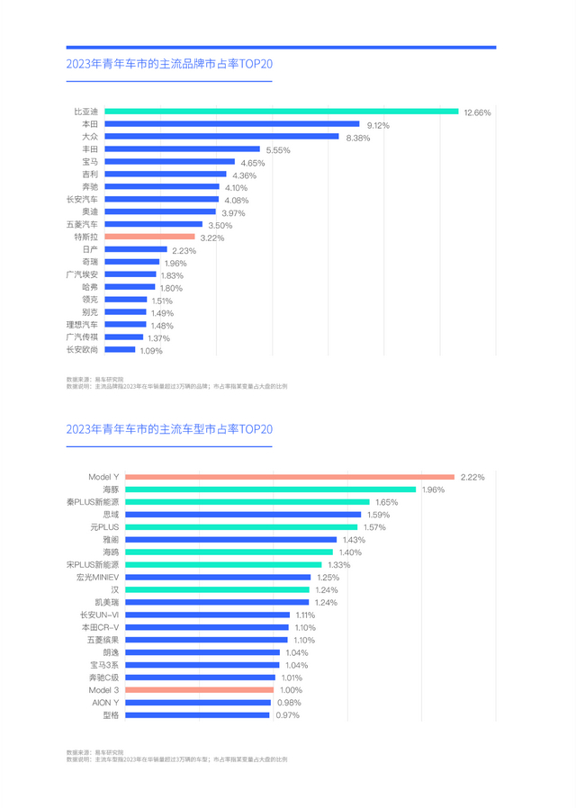比亚迪在青年车市的成功逆袭,给本田、吉利等一直非常注重年轻化战略的普通品牌,构成了非常大的挑战。特斯拉在高端青年车市的快速崛起,也给奥迪、奔驰、宝马等一直非常注重年轻化战略的高端品牌,构成了非常大的挑战。2023年,特斯拉在青年车市的市占率紧随BBA,但Model Y位居青年车市主流车型市占率排行的榜首,力压BBA的34C,给BBA在华销量的可持续增长埋下了巨大隐患。