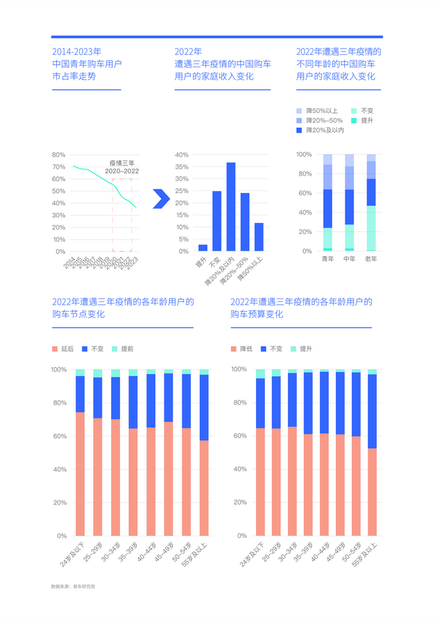 疫情三年冲击了不少中国购车用户的收入,2022年购车用户的家庭收入有提升的占比仅为2.71%,维持不变的有24.84%,其余都是下滑,36.69%下滑20%及以内,24.06%下滑20%~50%,11.69%下滑超50%。对比中年与老年,财富积累少与工作经验少的青年家庭更容易遭受冲击,2022年收入下滑占比高达76.07%,导致70%多的青年用户推迟购车,65%的青年用户降低购车预算;