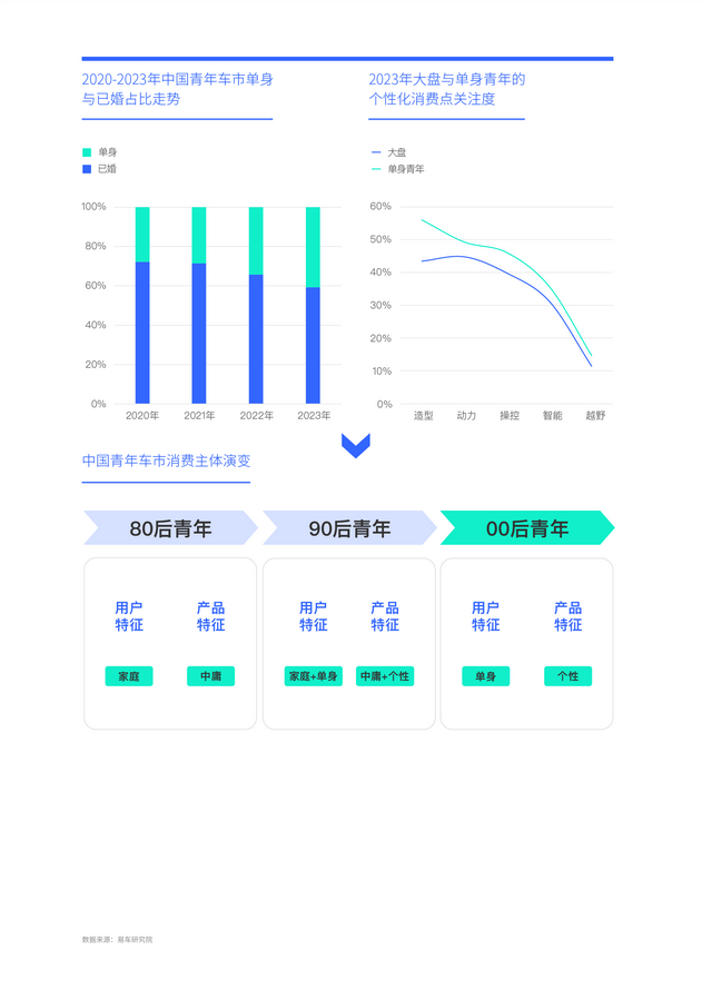00后青年开始崭露头角的2020-2023年,中国青年车市的单身占比升至40.67%,加速助推中国车市个性化