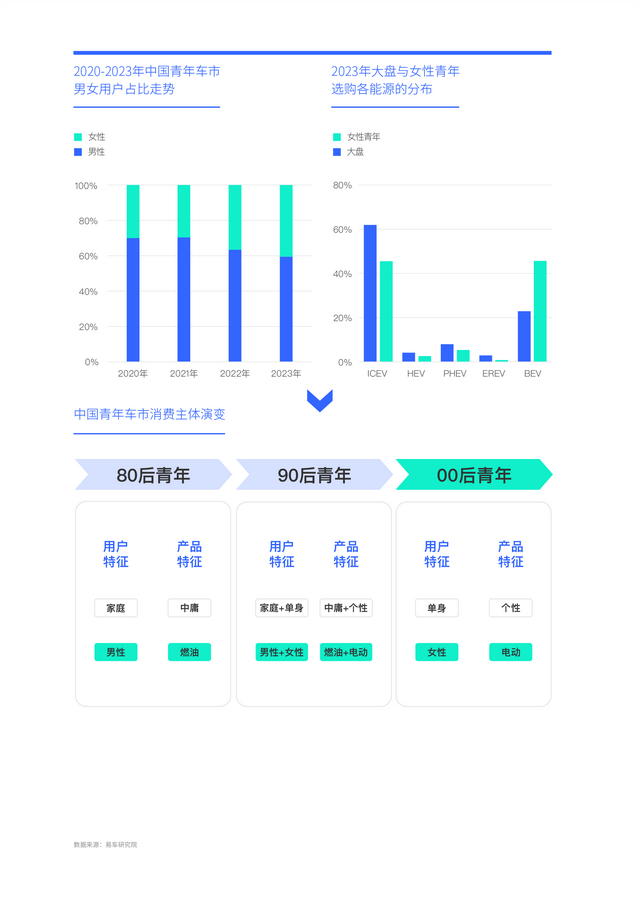 00后青年开始崭露头角的2020-2023年,中国青年车市的女性化占比突破40%,加速助推中国车市电动化