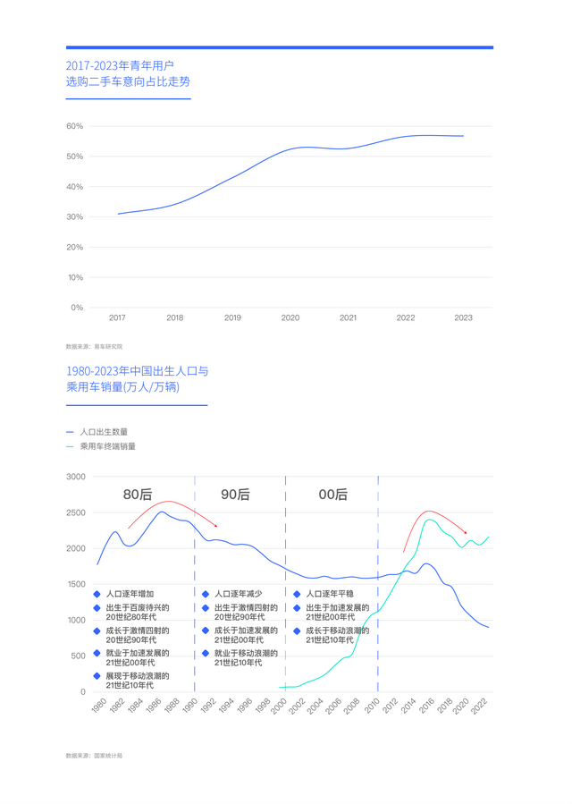2017年后,在90后青年加速涌入中国车市之际,由于90后与80后的生活时代与购车偏好有巨大差异,再加90后的出生人口持续下滑,以及90后更理性与成熟的消费心态(接受二手车)等,导致80后青年更偏好的经济中庸车型的销量纷纷出现大幅下滑与崩盘,并助推了二手车市场发展,2020-2023年,90后主导的中国青年选购二手车的意向占比突破50%;