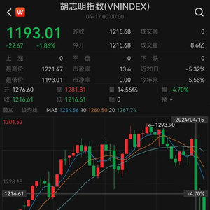 4月15日,越南VN指数日内大跌超4%,创下2024年初以来的最大跌幅。