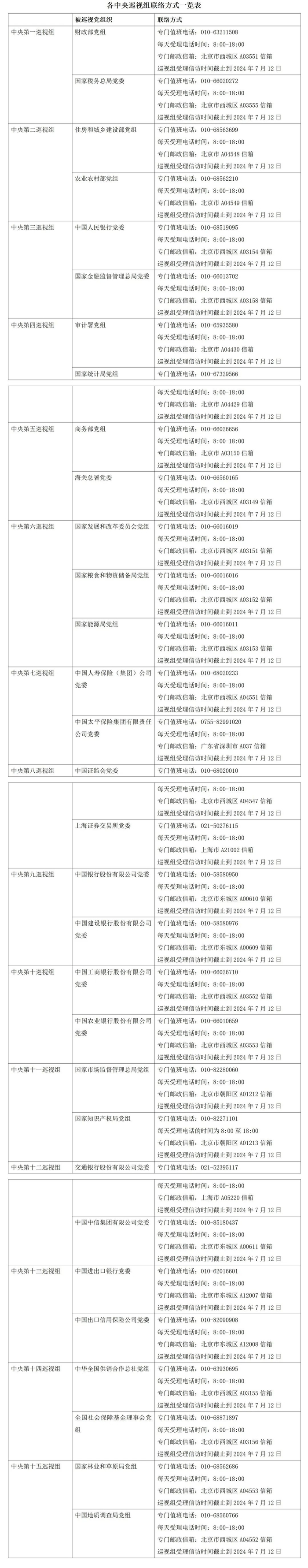 各中央巡视组巡视对象及组长一览: