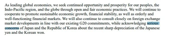他们在一份声明中称,他们“了解日本和韩国对近期日元和韩元大幅贬值的严重关切(态度),将会根据我们现有的G20集团承诺,继续就外汇市场的发展进行密切磋商。”