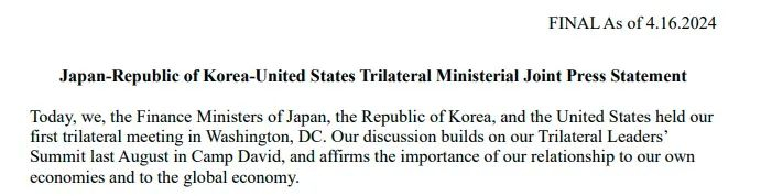 据财联社,当地时间本周三(4月17日),美日韩三边财长会议在位于华盛顿的美国财政部大楼举行。此次会议就日韩高度关切的本国货币近期快速贬值的情况交换了意见,并商定就汇市波动保持沟通。联合声明显示,日本和韩国财长对两国汇率近来的大幅下跌严重关切。