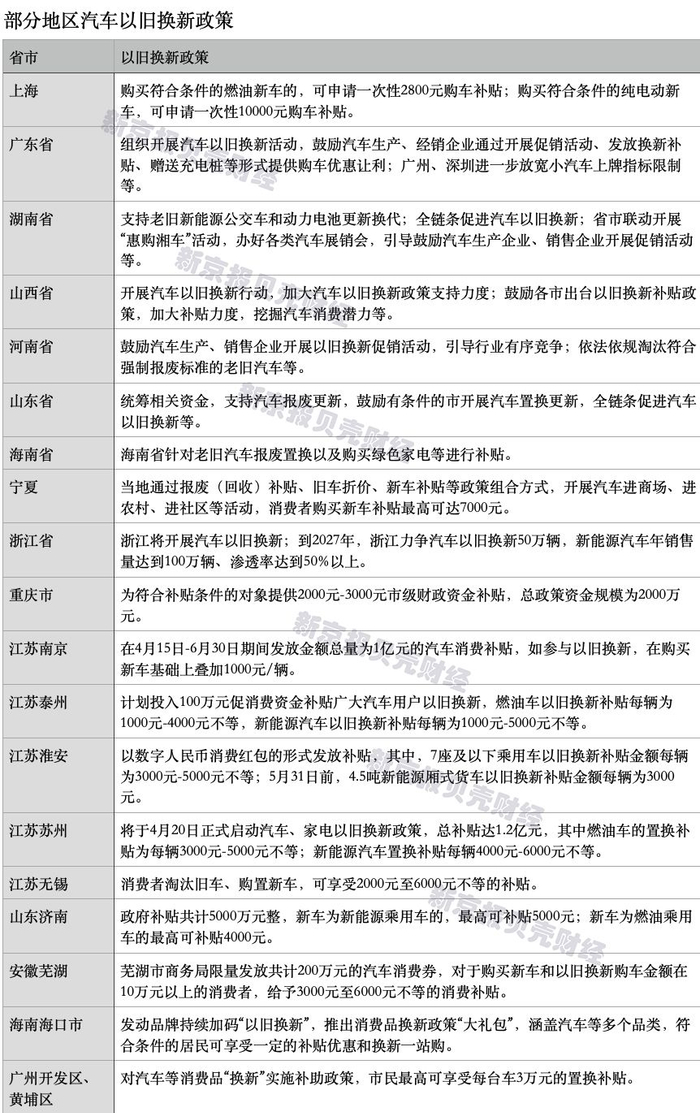 贝壳财经记者梳理看到,上海、江苏南京、重庆、宁夏、山东等多地相继出台了以旧换新政策。上海日前公布了新一轮燃油车以旧换新补贴、新能源汽车置换政策,其中燃油车可申请一次性2800元的购车补贴,新能源汽车可申请一次性1万元的购车补贴。重庆为符合补贴条件的对象提供2000元-3000元市级财政资金补贴,总政策资金规模为2000万元。宁夏启动汽车等消费品以旧换新促消费活动,银川、吴忠、石嘴山等将提供最高7000元新车补贴。此外,江苏南京4月15日至6月30日将发放1亿元汽车消费补贴,可在新车补贴的基础上叠加1000元/辆的补贴。