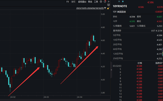 报道指出,在美国财政部拍卖的390亿美元10年期国债遭遇需求低迷局面后,过去一周里,高于预期的美国通胀数据引发的抛售潮加剧。投资者对3年期和30年期美国国债的拍卖活动也兴趣平平。他们的谨慎背后隐藏着一种越来越强烈的信念:通胀尚未完全得到控制,美联储未来数月(如果不是数年的话)将把利率维持在数十年来的高位。10年期国债收益率是从抵押贷款到企业贷款等各种贷款利率的基准,目前约为4.5%,接近自去年10月达到5%以来的最高水平。