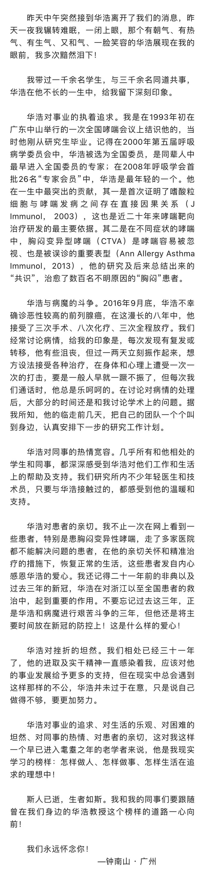 钟南山发文悼念: