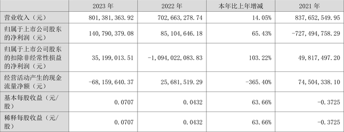 中证智能财讯 汇洲智能(002122)4月19日披露2023年年报。2023年,公司实现营业总收入8.01亿元,同比增长14.05%;归母净利润1.41亿元,同比增长65.43%;扣非净利润3519.90万元,同比扭亏;经营活动产生的现金流量净额为-6815.96万元,上年同期为2568.15万元;报告期内,汇洲智能基本每股收益为0.0707元,加权平均净资产收益率为6.45%。