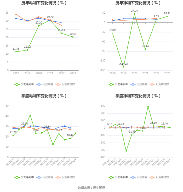 2023年,公司毛利率为20.37%,同比下降2.27个百分点;净利率为18.91%,较上年同期上升9.86个百分点。从单季度指标来看,2023年第四季度公司毛利率为23.58%,同比上升11.09个百分点,环比上升5.14个百分点;净利率为5.61%,较上年同期下降290.02个百分点,较上一季度下降10.79个百分点。