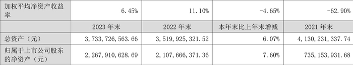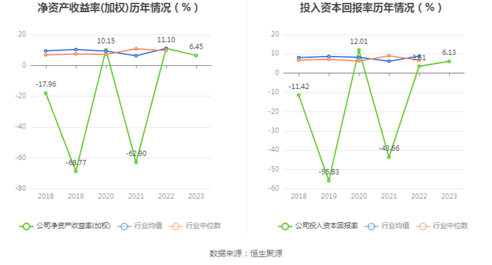 数据显示,2023年公司加权平均净资产收益率为6.45%,较上年同期下降4.65个百分点;公司2023年投入资本回报率为6.13%,较上年同期增长2.52个百分点。