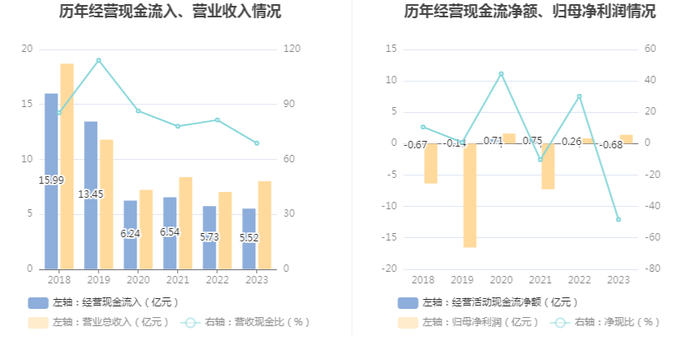 2023年,公司营业收入现金比为68.83%,净现比为-48.41%。