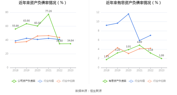 在偿债能力方面,公司2023年年末资产负债率为34.64%,相比上年末上升0.04个百分点;有息资产负债率为1.99%,相比上年末下降1.19个百分点。