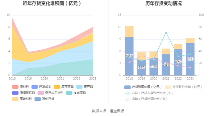 从存货变动来看,截至2023年年末,公司存货账面价值为8.03亿元,占净资产的35.39%,较上年末增加1.42亿元。其中,存货跌价准备为1.19亿元,计提比例为12.95%。