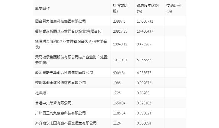 年报显示,2023年年末公司十大流通股东中,新进股东为香港中央结算有限公司、广州四三九九信息科技有限公司、齐齐哈尔市国有资本投资运营有限公司,取代了三季度末的喀什星河创业投资有限公司、恒天融泽资产管理有限公司-恒天融泽嘉星三号私募投资基金、恒天融泽资产管理有限公司-恒天融泽嘉星五号私募投资基金。在具体持股比例上,杜洪海持股有所上升,四合聚力信息科技集团有限公司、衢州智造祈爵企业管理合伙企业(有限合伙)、博厚明久(衢州)企业管理咨询合伙企业(有限合伙)、天马轴承集团股份有限公司破产企业财产处置专用账户、霍尔果斯天马创业投资集团有限公司、深圳华创金盛投资咨询有限公司持股有所下降。