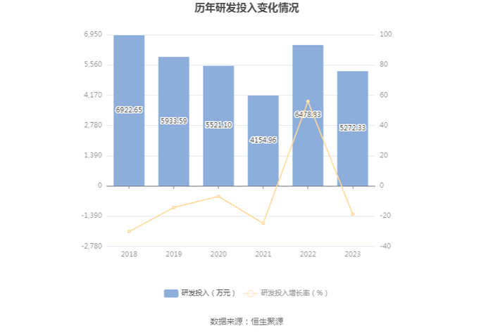 2023年全年,公司研发投入金额为5272.33万元,同比下降18.62%;研发投入占营业收入比例为6.58%,相比上年同期下降2.64个百分点。此外,公司全年研发投入资本化率为23.57%。