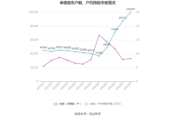 筹码集中度方面,截至2023年年末,公司股东总户数为10.05万户,较三季度末增长了1.27万户,增幅14.51%;户均持股市值由三季度末的7.95万元上升至8.30万元,增幅为4.40%。