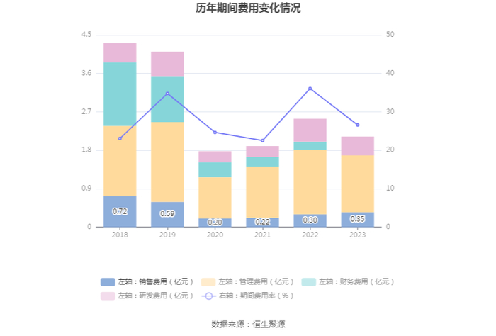 2023年,公司期间费用为2.13亿元,较上年同期减少4047.29万元;期间费用率为26.59%,较上年同期下降9.50个百分点。其中,销售费用同比增长18.33%,管理费用同比下降11.49%,研发费用同比下降18.02%,财务费用由去年同期的1875.56万元变为-12.56万元。