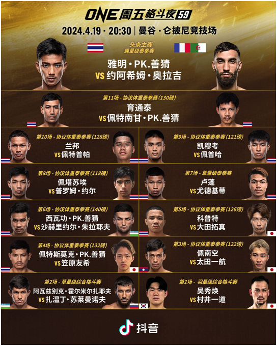 4月19日晚8:30,国际知名体育IP--ONE冠军赛举办的“ONE格斗夜”大型格斗赛事即将在曼谷仑披尼竞技场上演。当晚共有12场比赛,其中包括10场泰拳赛和2场综合格斗赛,其中四位拳手来自泰国的善猜拳馆,他们将上演各自的精彩对决。雅明-PK-善猜(Yamin PK Saenchai)、约阿希姆-奥拉吉(Joachim Ouraghi)和育通泰(Yodthongthai)等多位选手均在上一场比赛中获得了花红。