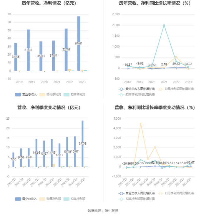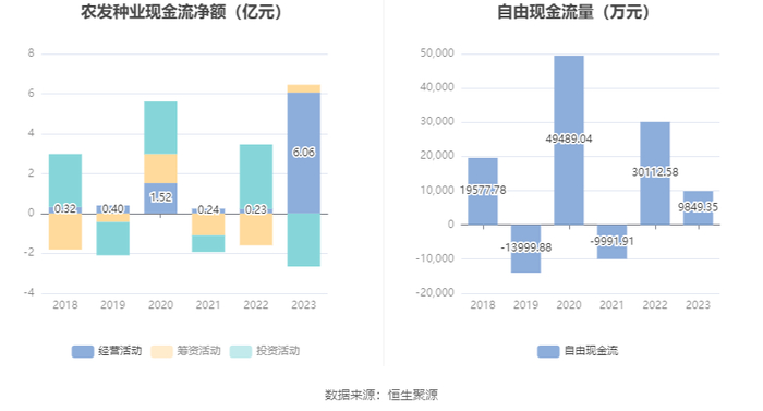 2023年,公司经营活动现金流净额为6.06亿元,同比增长2558.34%;筹资活动现金流净额3866.00万元,同比增加1.99亿元;投资活动现金流净额-2.66亿元,上年同期为3.23亿元。