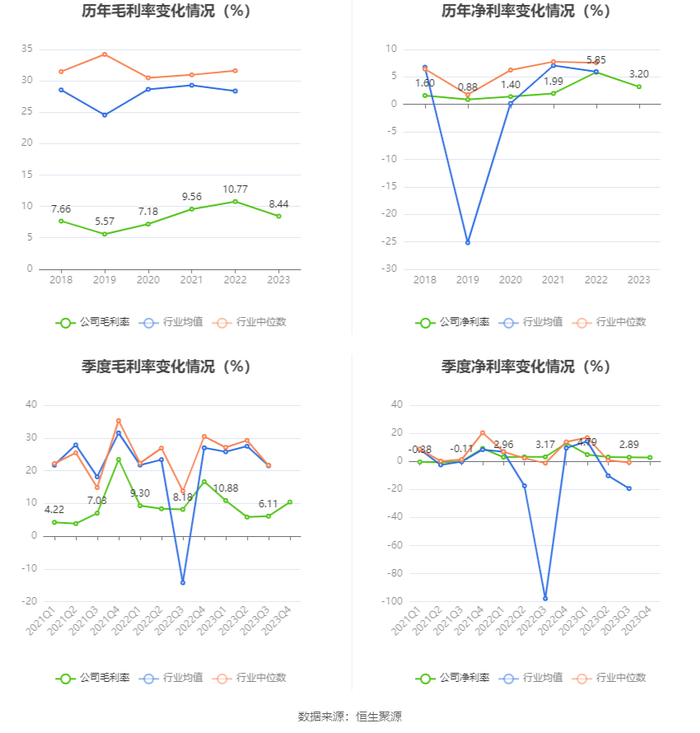 2023年,公司毛利率为8.44%,同比下降2.33个百分点;净利率为3.20%,较上年同期下降2.65个百分点。从单季度指标来看,2023年第四季度公司毛利率为10.42%,同比下降6.22个百分点,环比上升4.31个百分点;净利率为2.71%,较上年同期下降10.31个百分点,较上一季度下降0.18个百分点。