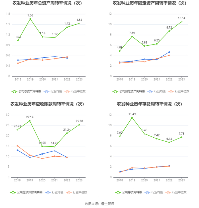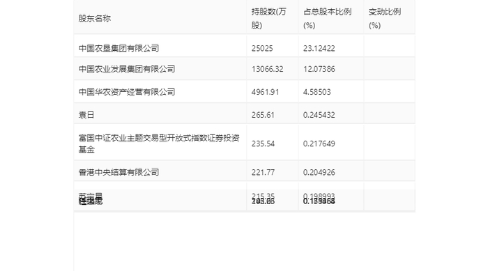 年报显示,2023年年末公司十大流通股东中,新进股东为香港中央结算有限公司、苏宝星、杜之家、任强,取代了三季度末的郭文江、中信证券股份有限公司、中国农业银行股份有限公司-银华内需精选混合型证券投资基金(LOF)、闵娅萍。在具体持股比例上,中国华农资产经营有限公司、袁日持股有所上升,富国中证农业主题交易型开放式指数证券投资基金、洪小见持股有所下降。