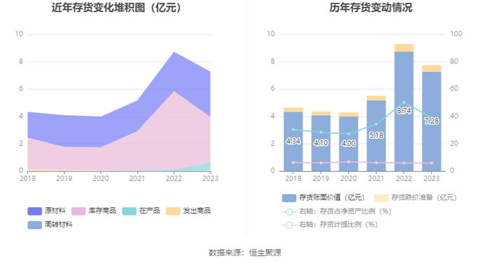 从存货变动来看,截至2023年年末,公司存货账面价值为7.28亿元,占净资产的39.05%,较上年末减少1.46亿元。其中,存货跌价准备为4654.48万元,计提比例为6.01%。
