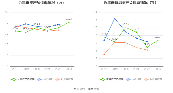 在偿债能力方面,公司2023年年末资产负债率为40.47%,相比上年末上升4.96个百分点;有息资产负债率为6.68%,相比上年末上升1.73个百分点。