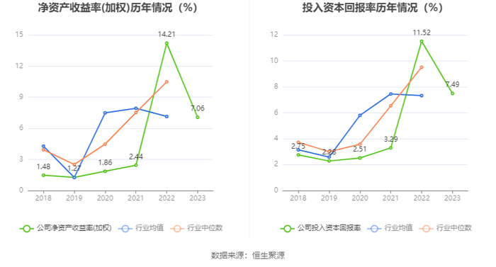 数据显示,2023年公司加权平均净资产收益率为7.06%,较上年同期下降7.15个百分点;公司2023年投入资本回报率为7.49%,较上年同期下降4.03个百分点。