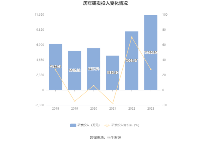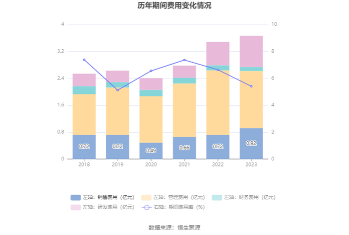 2023年,公司期间费用为3.66亿元,较上年同期增加1824.47万元;但期间费用率为5.42%,较上年同期下降1.22个百分点。其中,销售费用同比增长28.23%,管理费用同比下降11.48%,研发费用同比增长32.14%,财务费用同比下降17.2%。