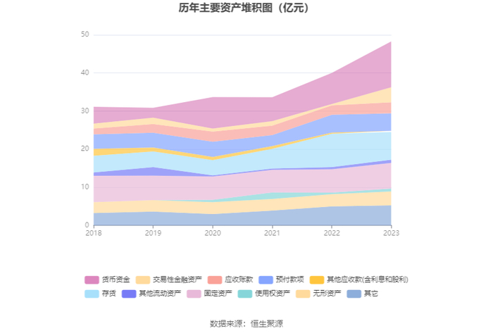 资产重大变化方面,截至2023年年末,公司交易性金融资产较上年末增加1110.13%,占公司总资产比重上升7.38个百分点;存货较上年末减少16.75%,占公司总资产比重下降6.77个百分点;货币资金较上年末增加47.10%,占公司总资产比重上升4.48个百分点;预付款项较上年末减少1.25%,占公司总资产比重下降2.12个百分点。
