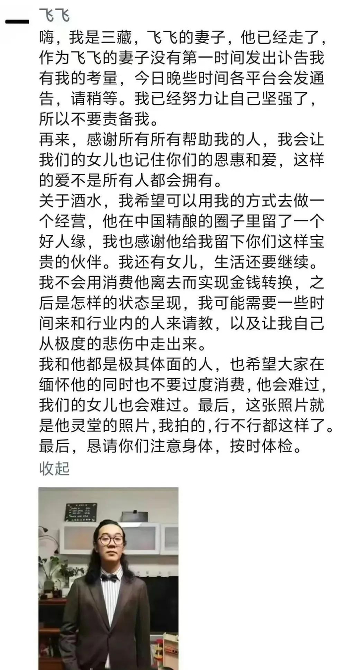 对于“飞飞一杯酒”的突然离世