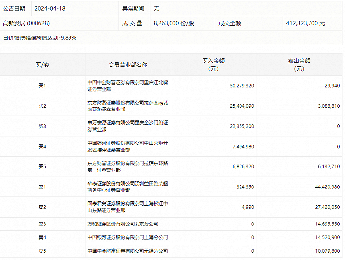 此前高新发展4月9日龙虎榜数据显示,深股通专用席位买入1亿元并卖出8506.58万元,一机构净买入5279.86万元,牛散葛卫东(国泰君安上海分公司)为卖一席位,净卖出1.89亿元。