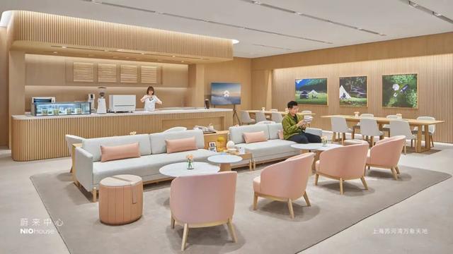 Club区与展厅以通透的玻璃幕墙为界,展现着蔚来社区愉悦温馨的氛围。内部圆润舒适的沙发椅与木色茶几组合放置于中央,既能与好友自成一体地休息、会谈,也能与吧台内的NHS伙伴隔空对话。