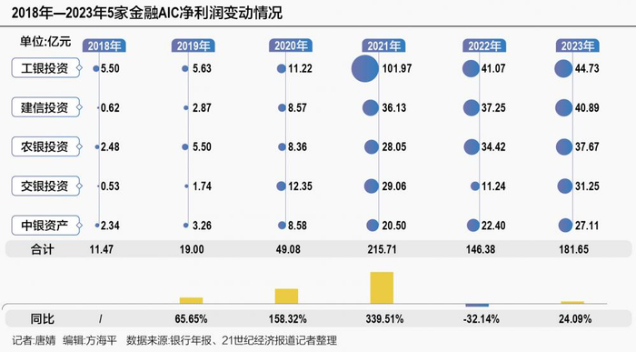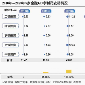 AIC净利润正在赶超AMC。年报数据显示,去年5家金融AIC合计实现净利润181.65亿元,同比增长24%。拉长时间来看,自2017年成立以来,5家金融AIC业绩在不同年份虽有波动但整体增长迅猛,合计净利润从2018年末的11.47亿元增长至2023年末的181.65亿元,增长了近15倍。