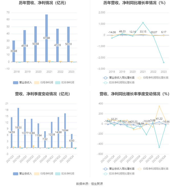 中证智能财讯 凯盛科技(600552)4月19日披露2023年年报。2023年,公司实现营业总收入50.10亿元,同比增长6.17%;归母净利润1.07亿元,同比下降24.37%;扣非净利润亏损5243.72万元,上年同期盈利225.31万元;经营活动产生的现金流量净额为1.33亿元,同比下降67.50%;报告期内,凯盛科技基本每股收益为0.1135元,加权平均净资产收益率为2.54%。公司2023年年度利润分配预案为:拟向全体股东每10股派0.5元(含税)。