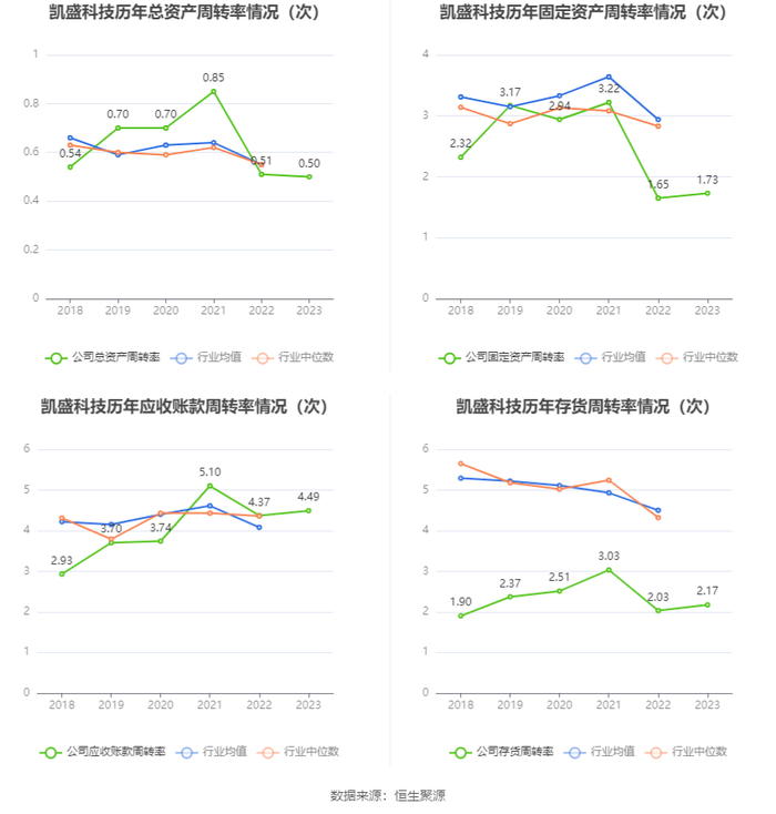 营运能力方面,2023年,公司公司总资产周转率为0.50次,上年同期为0.51次(2022年行业平均值为0.55次,公司位居同行业23/42);固定资产周转率为1.73次,上年同期为1.65次(2022年行业平均值为2.94次,公司位居同行业27/42);公司应收账款周转率、存货周转率分别为4.49次、2.17次。