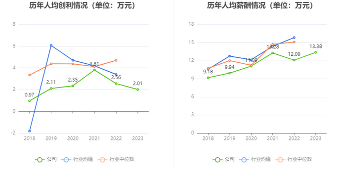 截至2023年末,公司员工总数为5333人,人均创收93.94万元,人均创利2.01万元,人均薪酬13.38万元,较上年同期分别变化10.13%、-21.55%、10.66%。