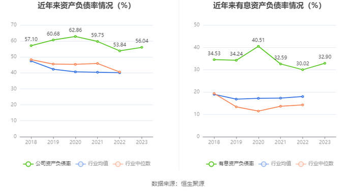 在偿债能力方面,公司2023年年末资产负债率为56.04%,相比上年末上升2.20个百分点;有息资产负债率为32.90%,相比上年末上升2.88个百分点。