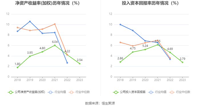 数据显示,2023年公司加权平均净资产收益率为2.54%,较上年同期下降1.68个百分点;公司2023年投入资本回报率为2.79%,较上年同期下降1.90个百分点。