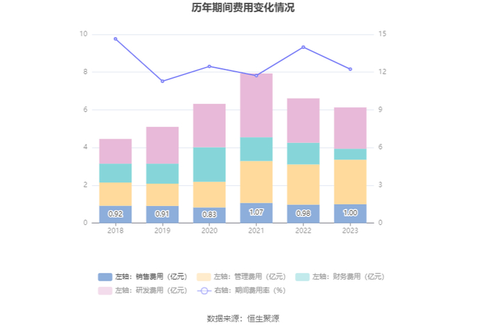2023年,公司期间费用为6.13亿元,较上年同期减少4710.26万元;期间费用率为12.24%,较上年同期下降1.75个百分点。其中,销售费用同比增长2.27%,管理费用同比增长11.13%,研发费用同比下降6.77%,财务费用同比下降49.66%。