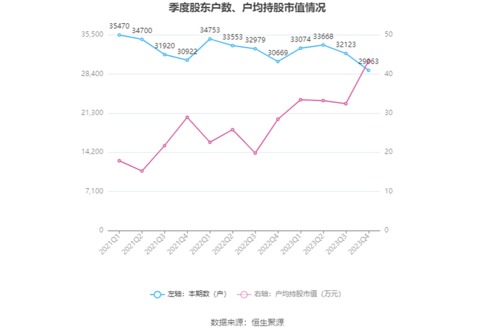 筹码集中度方面,截至2023年年末,公司股东总户数为2.91万户,较三季度末下降了3060户,降幅9.53%;户均持股市值由三季度末的32.43万元上升至43.33万元,增幅为33.61%。