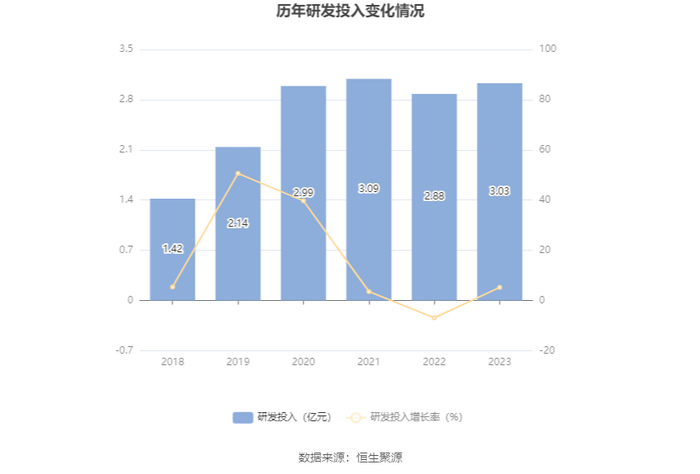 2023年全年,公司研发投入金额为3.03亿元,同比增长5.23%;研发投入占营业收入比例为6.05%,相比上年同期下降0.18个百分点。此外,公司全年研发投入资本化率为27.62%。