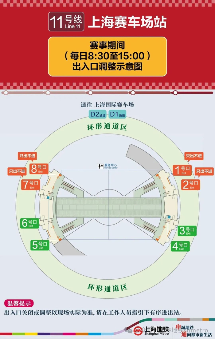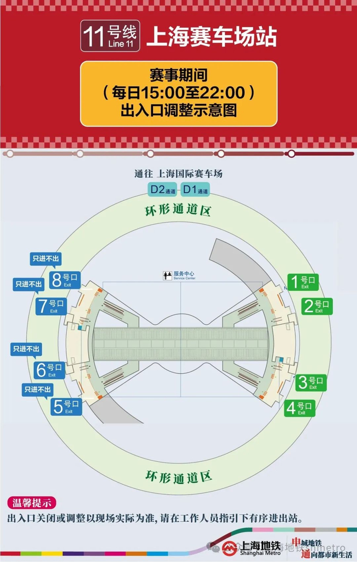 申通地铁集团介绍,2024年F1中国大奖赛于4月19日至4月21日将在上海国际赛车场举行,赛事期间,为保障乘客出行安全,上海地铁11号线上海赛车场站将采取出入口管控措施。详见↓